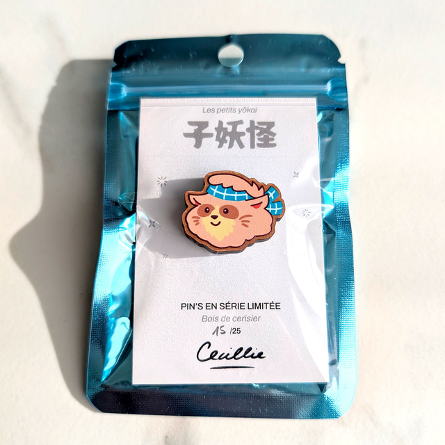 🇬🇧 "The small Yōkai" - Tanuki pin - Cherry wood veneer pin, limited edition. Size 30 mm.