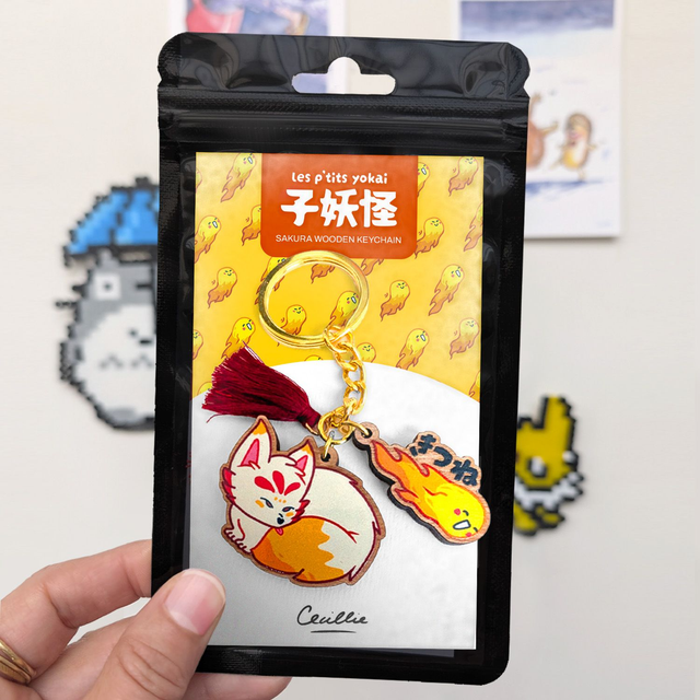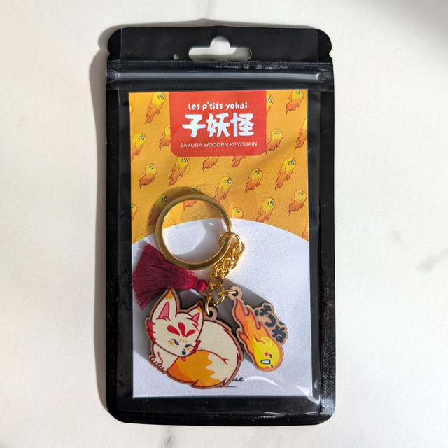 🇬🇧 "The small Yōkai" - Kitsune keychain - Cherry wood veneer pin, limited edition.