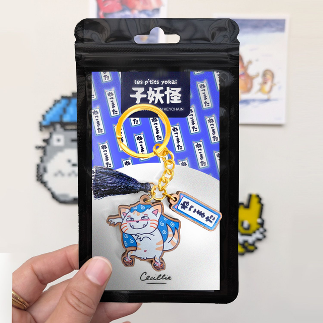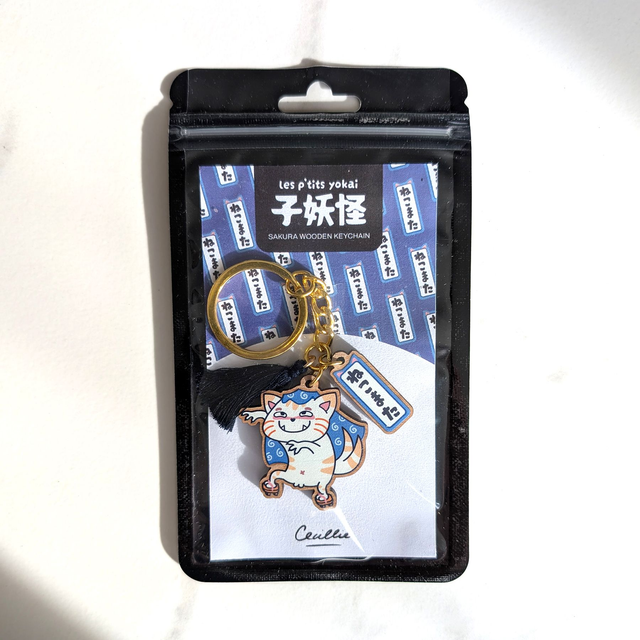 🇬🇧 "The small Yōkai" - Nekomata keychain - Cherry wood veneer pin, limited edition.