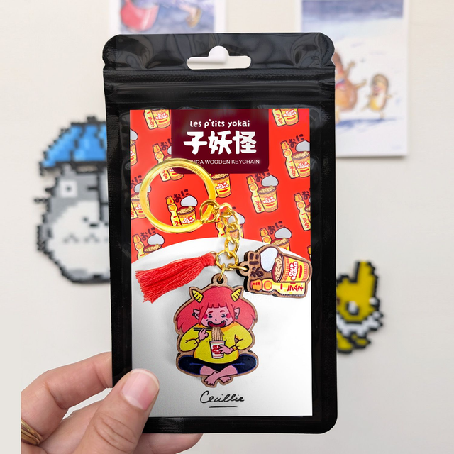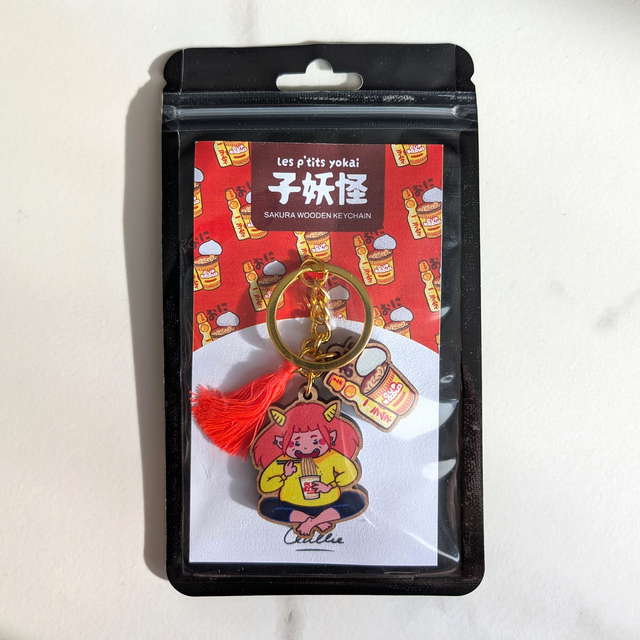 🇬🇧 "The small Yōkai" - Oni and noodles keychain - Cherry wood veneer pin, limited edition.